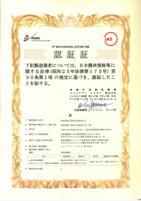 沭阳亚森久得利木业自2011年10月3日获得JAS认证(LVL for fixtures)以来,已经积累了近14年的JAS生产经验。在2024年1月5日,公司再次获得JAS 140E SLVL认证。此外,公司还持有FSC森林认证和CFCC/PEFC-COC森林认证。本公司拥有配备完善的JAS实验室,能够执行包括浸渍剥离实验、含水率实验、甲醛释放量实验、静曲强度实验和水平剪切力实验在内的多项产品测试。